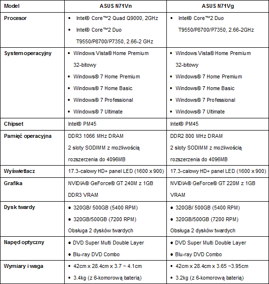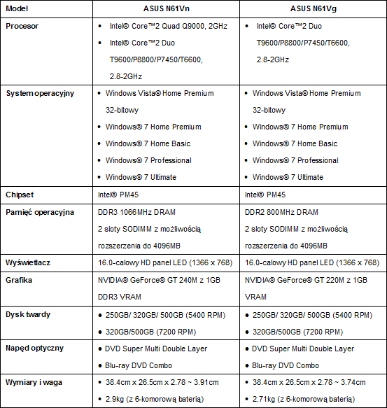 Notebooki ASUS N61 i ASUS N71 będą dostępne w Polsce na początku października. Sugerowane ceny N61: 2999 PLN, N71: 3199 PLN.