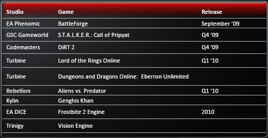 AMD współpracuje z developerami gier nad wprowadzeniem nowych tytułów obsługujących API DirectX 11. Wygląda na to, że w przeciwieństwie do poprzednich API nie będziemy długo czekać na odpowiednie gry. Pierwszą ma być BattleForge. Prawdopodobnie gra dostanie łatkę z obsługą DirectX 11, która ma zapewnić szybsze działanie gry. Jeszcze w tym roku mają wyjść Dirt 2 oraz STALKER: Call of Pripyat wykorzystujące DX11 zarówno do poprawienia wydajności jak i polepszenia jakości wyświetlanej grafiki. Natomiast w przyszłym roku czekają nas takie hity jak Alien vs Predator czy BattleField 1943 i BattleField Bad Company 2 na silniku FrostBite 2 obsługującym DirectX 11.