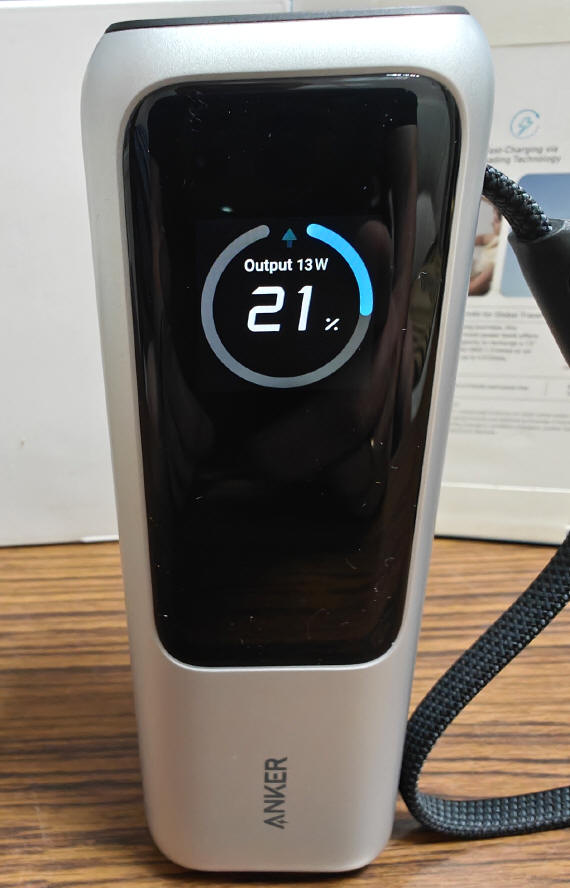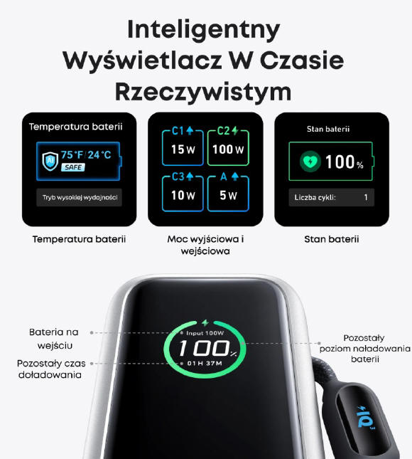 ANKER A1695H11 należy do urządzeń, które można polubić, zwłaszcza że jest to gadżet niemal interaktywny. Tuż po naciśnięciu bocznego przycisku pojawią się wpierw na ekranie dwa mrugające oczka, później uśmiech i będziemy mogli zerknąć na obecny stan naładowania ogniw. Podobna reakcja nastąpi po wysunięciu zwijanego przewodu.