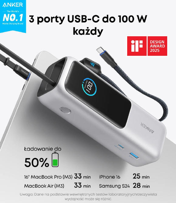 Kiedy dostałem propozycję przetestowania powerbanku marki ANKER, pomyślałem sobie "o rany, kolejny art o kostce energii" tyle, że o powiększonej pojemności 25000 mAh, bo przeważnie teraz wybieramy modele 20000 mAh. Jednak kiedy wgłębiłem się w otrzymanego mail’a, zobaczyłem, że ten niepozorny prostokąt potrafi łącznie wykrzesać z siebie aż 165W mocy. Jaki to model? I tu jest pewien problem, bo ANKER stosuje dziwny sposób oznaczania swoich produktów. Zazwyczaj mamy markę, jakąś indywidualną nazwę i na przykład numer. Tymczasem na stronie producenta znajdziemy wpis - "Powerbank z serii Anker Laptop (25 tys, 165 W, wbudowany i chowany kabel)". Na potrzeby tej recenzji przyjmijmy zatem nazwę handlową, którą próżno szukać na opakowaniu, ale pojawia się ona na witrynach sklepów Internetowych - ANKER Laptop A1695H11 25000mAh 165W, którą będę się posługiwał w dalszej części tego artykułu.