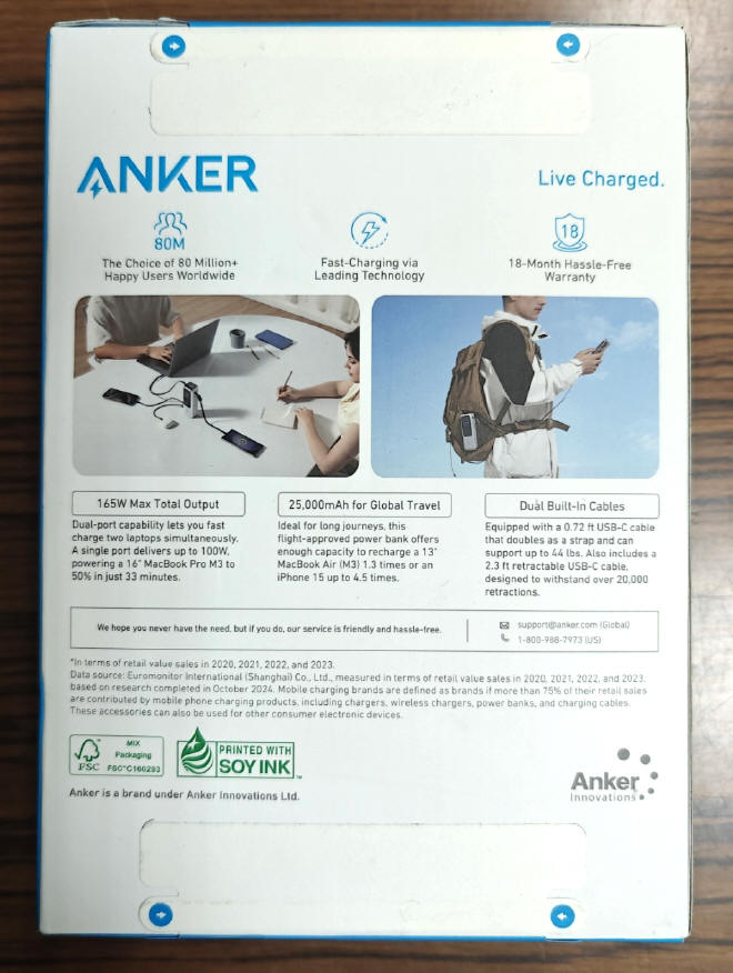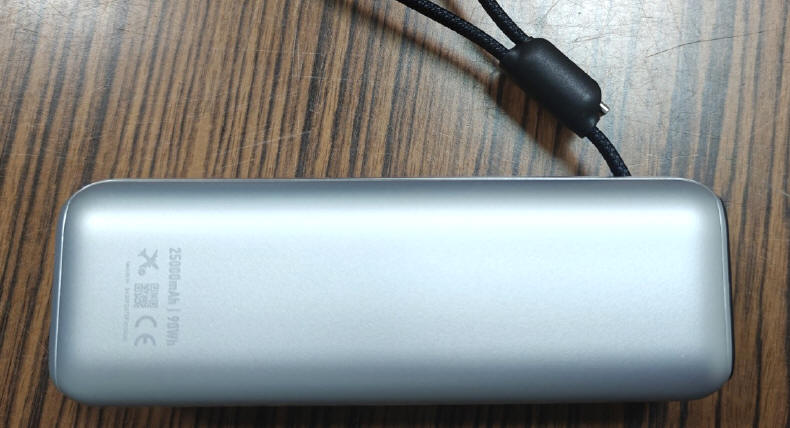 Na tyle kadłubka ograniczono się do podania ikon aprobacji produktu przez linie lotnicze (przynajmniej niektóre) oraz podanie pojemności (25000 mAh / 90 Wh).