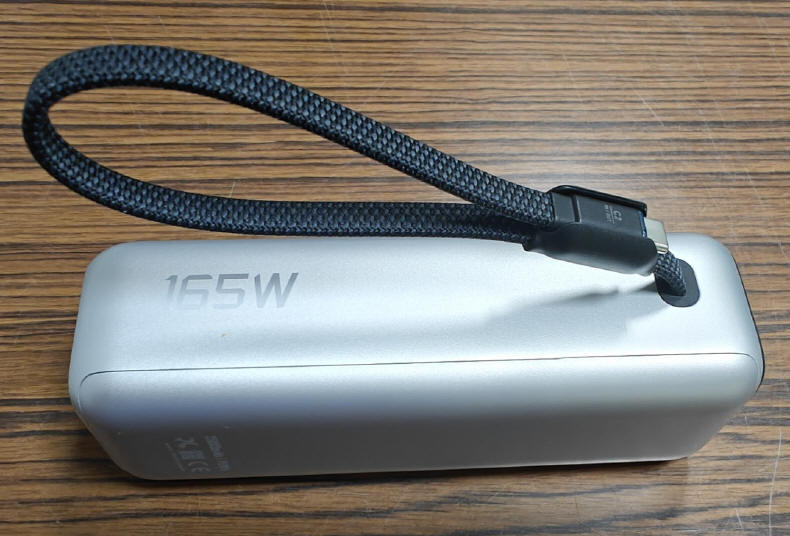 Drugi kabelek (długość 27 cm) stanowi jednocześnie zawieszkę, za pomocą której możemy sobie przytroczyć powerbank do plecaka lub opleść wokół nadgarstka. Wsuwka, w którą wpinamy wtyczkę USB-c, co tworzy mocną pętlę, jest naprawdę solidna, więc nie będziemy musieli się obawiać, że nie utrzyma dość ciężkiego urządzenia (niemal 0.6 kilograma), a sam kabelek jest wzmocniony grubym, solidnym, tekstylnym oplotem.
