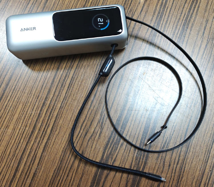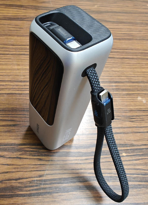Spytacie, że co, tylko dwa gniazda? Otóż ANKER daje nam możliwość nie noszenia z sobą okablowania, bo w standardzie dostajemy dwa przewody USB-c, ale dość sprytnie ukryte, bo jeden na górze kadłubka jest automatycznie zwijany, jak kabel odkurzacza (całkowita długość, to 65 centymetrów) i co ważne możemy go wysunąć tyle, ile aktualnie będziemy potrzebować, bo posiada mechanizm samohamujący. Kolejne pociągnięcie go powoduje przejście w stan zwijania. Jego wtyczka jest unieruchomiona mocnym magnesem, co zapobiega jej odstawaniu od obudowy. Według producenta mechanizm zwijania jest bardzo trwały i może przetrwać około 20 tysięcy cykli pracy.