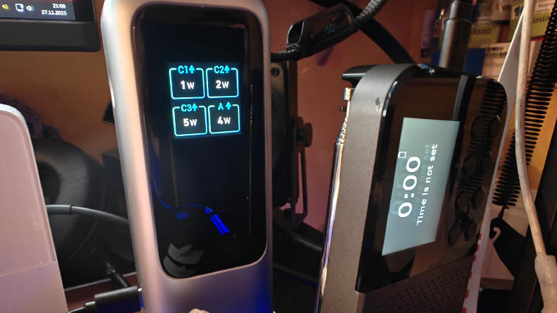 Jeśli jednak chcemy się dowiedzieć, ile mocy oddają poszczególne "gniazda", wciskamy ponownie boczny przycisk i otrzymujemy pełne dane. C1 - oznaczony jest wysuwany przewód, C2 - boczna "pętelka", C3 - to gniazdo na bocznym panelu, natomiast C4 - przydzielono dla portu USB-A.