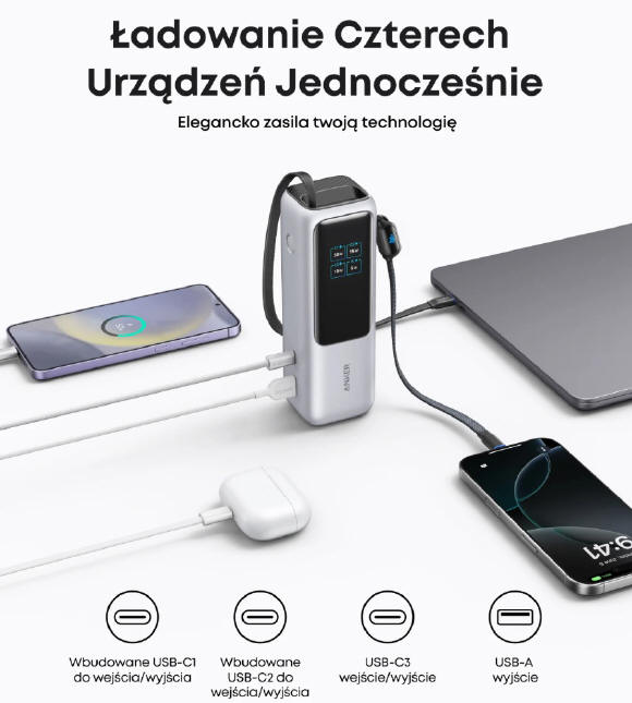 Niemniej nawet przy jego niedoskonałościach w oddawaniu maksymalnych mocy, ANKER Laptop A1695H11 25000mAh 165W szybko stał się moim ulubionym powerbankiem i zajął dominujące miejsce na biurku. Jego niewątpliwym plusem, są dwa zintegrowane kable z końcówkami USB-c, a więc nie będzie od nas wymagane dołączanie zewnętrznych przewodów. Szybkie odpięcie lub pociągnięcie za jeden z nich i już możemy się podłączać z naszym urządzeniem.
