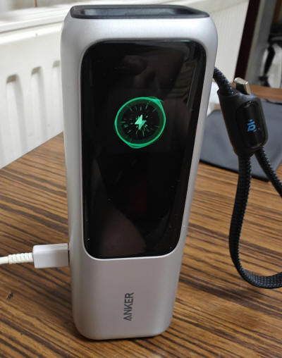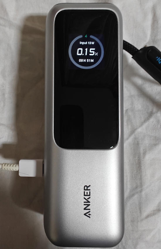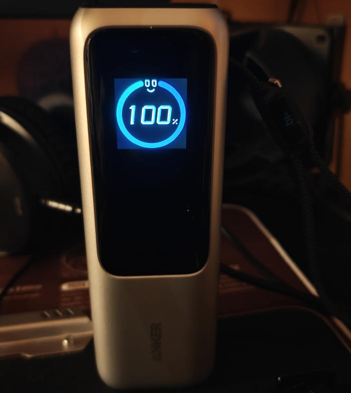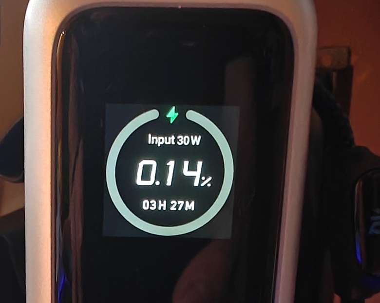 ANKER zapewnia nas, że produkt ten możemy szybko naładować za pomocą 100-watowych ładowarek. W czasie 20 minut mamy mieć możliwość "zassania" 30 procent całkowitej pojemności. Posiadam 100 watową ładowarkę od telefonu OnePLUS 12, więc niezwłocznie podłączyłem ją do pustego magazynu, ale wskazania na ekranie pokazały mi maksymalną moc ładowania na poziomie 33 Watów. Przy podpięciu źródła zasilania powerbank powita nas ładną animacją, po czym wskaże moc pobieraną z ładowarki i orientacyjny czas ładowania 3 godzin, 28 minut... Realny czas naładowania do 100% wyszedł w tym przypadku, dokładnie 3 godziny i 41 minut, a więc trochę dłużej. Pewnie było to wynikiem tego, że pod koniec ładowania system zaczął ograniczać jego moc. No cóż, ktoś tak sobie to po coś wymyślił.