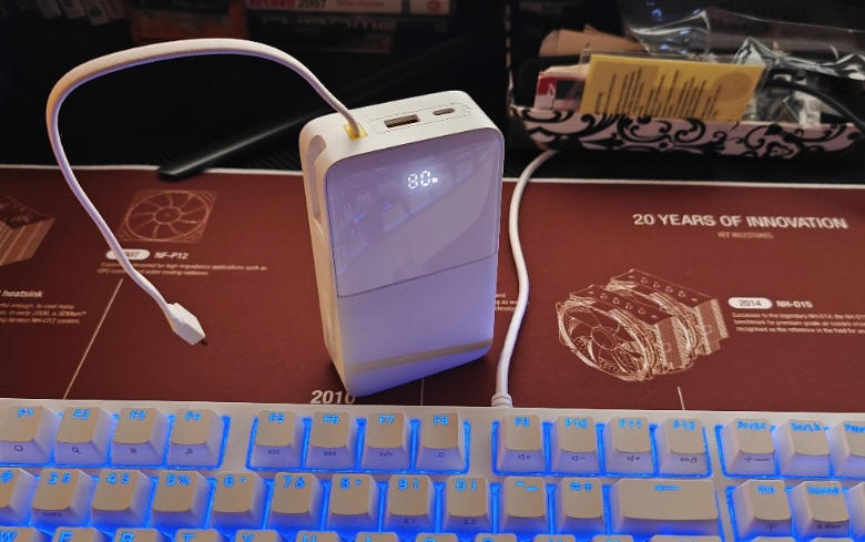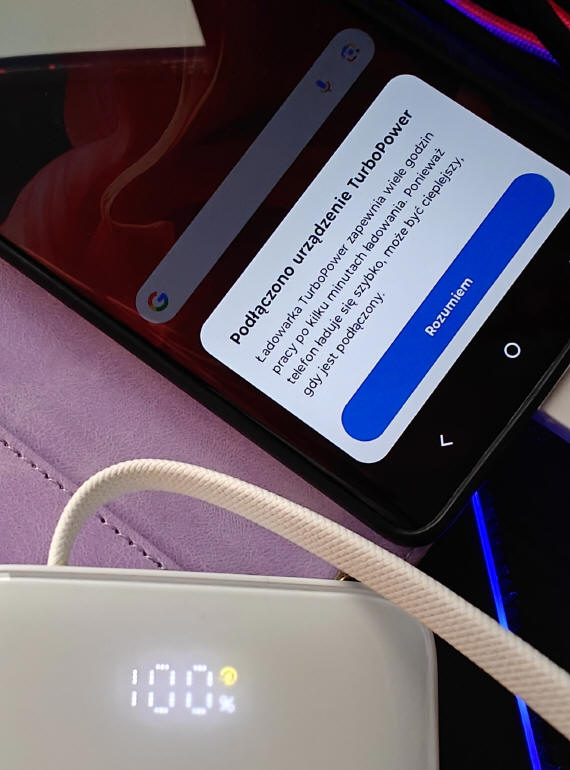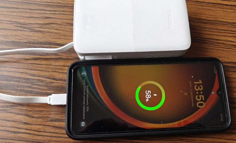 Ładowanie telefonu z baterią o pojemności 5000 mAh (od 2%), trwa nieco ponad półtorej godziny. Podłączony smartfon marki Motorola pokazywał nawet monit o podłączeniu ładowarki TurboPower i możliwości nagrzewania się telefonu podczas pracy, choć 20W dla iPhona i 22.5W dla urządzeń z Androidem, dziś już może nie powala, jest to wartość zupełnie zadowalająca. Zawartość energii w tym "banku" wystarcza na trzykrotne naładowanie takiego smartfonu.