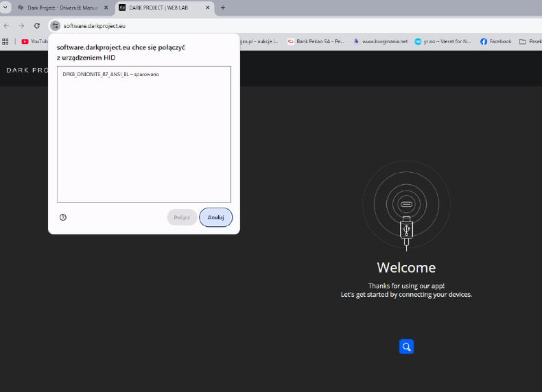 Po podłączeniu do komputera, ONIONITE V2 ożywa paletą barw i choć można skorzystać z opcji dostępnych z klawisza funkcyjnego, warto skorzystać z... oprogramowania On-Line. To genialna sprawa, bo sam jestem minimalistą i wrogiem dedykowanych aplikacji, które zaśmiecają system operacyjny. Tutaj nic nie ściągamy na dysk, a jedynie wchodzimy na stronę Internetową Producenta i wchodzimy w zakładkę Drives & Manuals i wybieramy swój model urządzenia. Po chwili specjalne narzędzie wykrywa podłączoną klawiaturę i prosi nas o zezwolenie na połączenie.