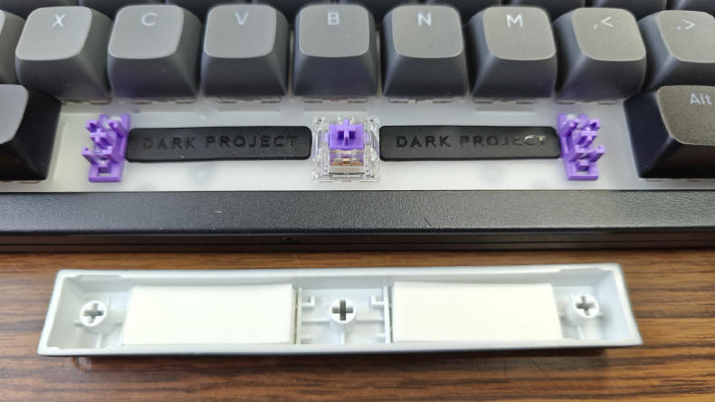 Wszelkie wibracje i kontakt części z częścią, zawsze skutkuje większym lub mniejszym hałasem, a w klawiaturach największym "grzechotnikiem", jest zazwyczaj największy przycisk, czyli spacja. Dlatego DARK PROJECT zastosował tam aż trzy miejsca podparcia (switch plus dwie mechaniczne prowadnice - wszystkie smarowane), dodatkowo wytłumiając ten klawisz gumowymi zderzakami. Jednak Ziemniakowi nadal jego dźwięk się nie podobał, dlatego pustą przestrzeń wypełnił jeszcze lekkimi, piankowymi wklejkami, które zneutralizowało odgłos pracy tego sporego kawałka plastiku.
