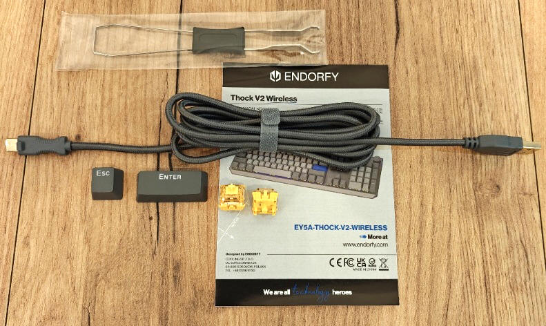 W środku opakowania znajdziemy dobrze zabezpieczony produkt ze sporą liczbą dodatków w postaci kabla USB (długość 1.8 metra), dwóch czapek klawiszy ESC i ENTER w kolorze szarym (domyślnie założone są keycapy niebieskie bez opisów), dwóch zapasowych, żółtych przełączników Gateron, klucz ułatwiający wymianę i instrukcję obsługi. Dodatkowo w zestawie znajduje się jeszcze klucz do zdejmowania cap’ów i nadajnik radiowy 2.4 GHz, ale one są zamocowane na spodzie kadłubka klawiatury.