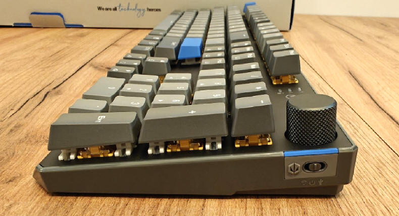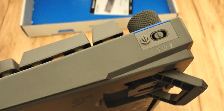 Na prawym boku producent umieścił dyskretny przełącznik trybu pracy naszej klawiatury, którym możemy wybrać - połączenia Bluetooth, nadajnika 2.4 GHz lub kabla USB.