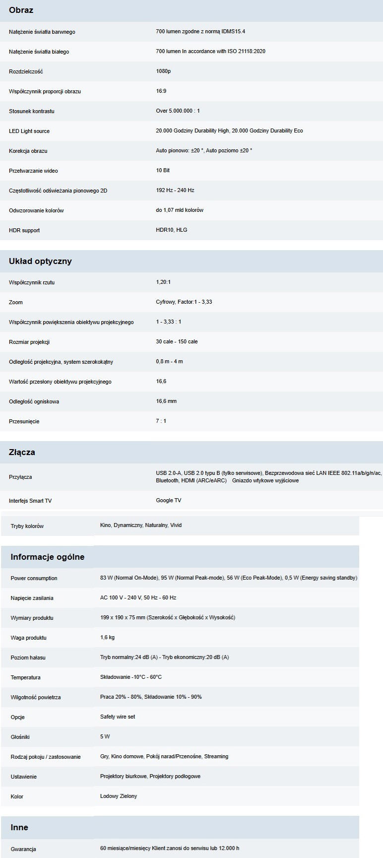 Sam projektor jest niedużych rozmiarów (199 x 190 x 75 mm) i waży zaledwie 1.6 kilograma, co z pewnością ułatwi jego przenoszenie, jeśli będziemy chcieli wyświetlać nasze filmy w plenerze. Pełne dane techniczne znajdziecie poniżej, ja tylko nadmienię, że w tym maleństwie znajdziecie takie same, zaawansowane technologie laserowe, jak u większych "braci", a mianowicie 3LCD z ciekłokrystaliczną migawką RGB, czy system Triple Core Engine.