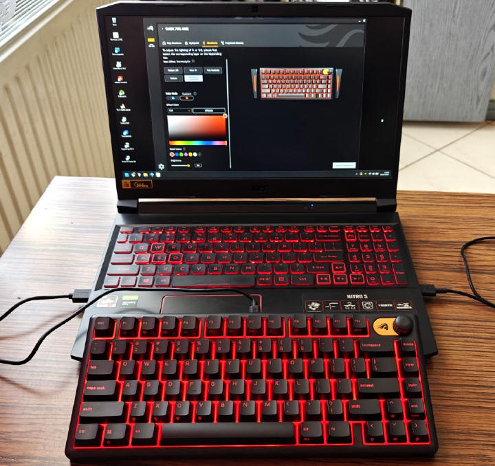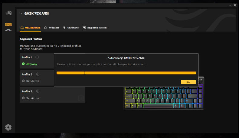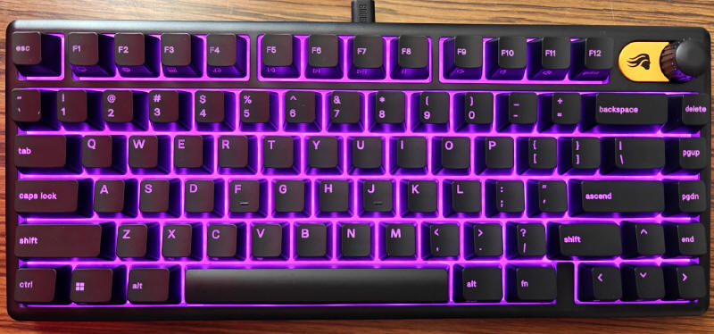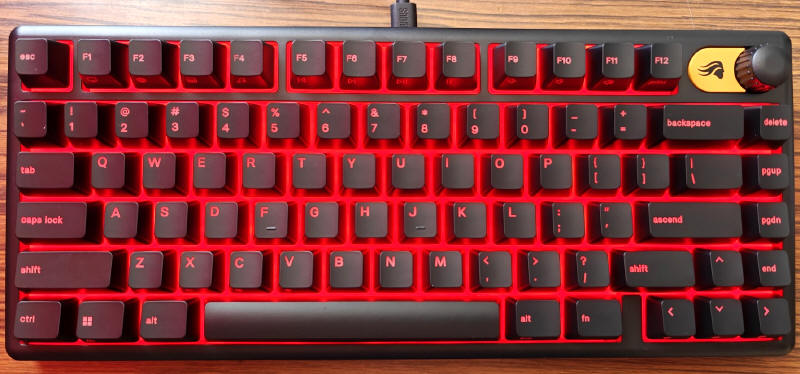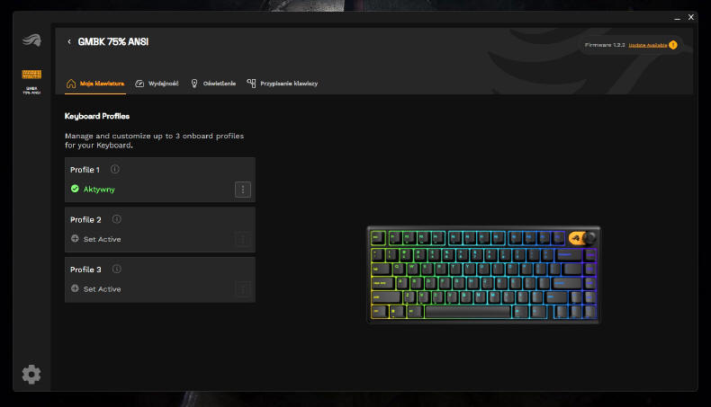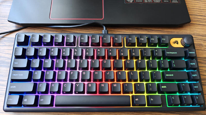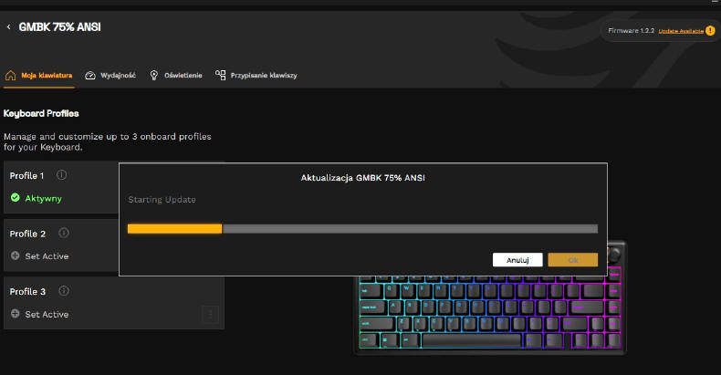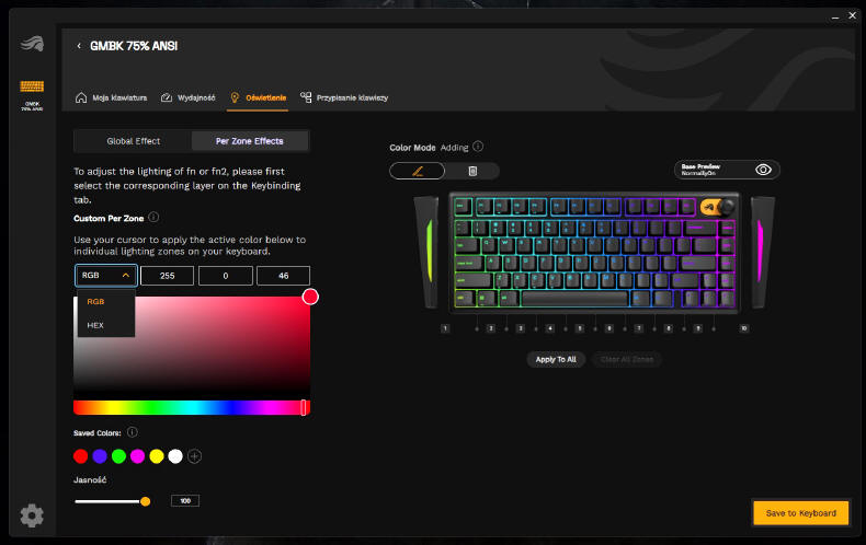 GLORIOUS GMBK 75% jest oczywiście urządzeniem typu Plug&Play, więc wystarczy je tylko podłączyć do komputera i system operacyjny natychmiast przydzieli mu podstawowe sterowniki. Po kilku sekundach możemy już działać na zasobach osiemdziesięciu klawiszy. Standardowo GMBK 75% uruchamia się w opcji podświetlenia zmieniającej się "tęczy" kolorów, ale za pomocą klawisza FN i skrótów przydzielonych do poszczególnych klawiszy, możemy w jakimś stopniu zmieniać iluminację i jego intensywność. Ale nie jest to zbyt wygodne, więc lepiej ściągnąć ze strony producenta aplikację Glorious CORE, która szybko wykryje naszą klawiaturę.