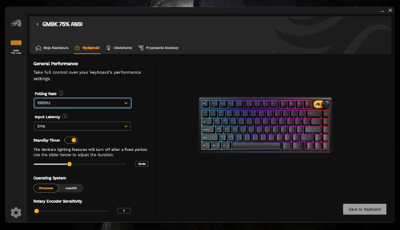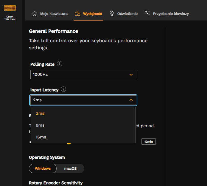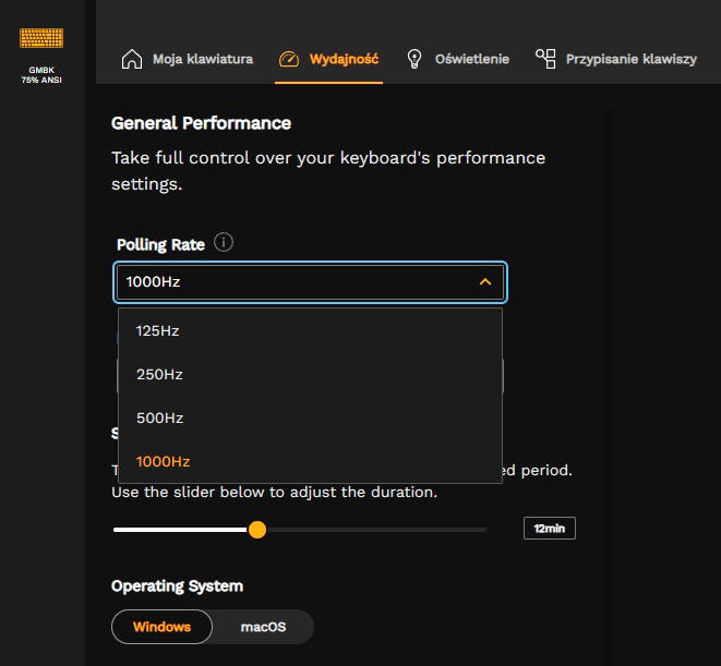 Możliwości ustawień parametrów klawiatury, są naprawdę spore. Możemy ustawić wartość Polling Rate w częstotliwościach próbkowania 125/250/500/1000 Hz i przy opóźnieniach wejściowych 2/8 i 16 milisekund. Oprogramowanie wspiera też wybór zarządzania przez system operacyjny Windows lub macOS.