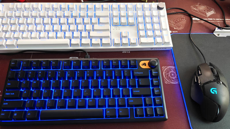 Czy to dobre rozwiązanie? Osobiście wolę mechaniczne rozwiązania w klawiaturach, ale być może po prostu już za długo z nimi obcuję na co dzień w pracy i przy rozrywce. To co zauważyłem podczas kilkunastu godzin rozgrywek w czołgach (WoT), to "membranki" świetnie spisywały się podczas długiego, statycznego trzymania przycisków kierunkowych WAD podczas dojazdów do miejsc walki. Po prostu raz naciśnięty klawisz trzymał stałe połączenie, podczas gdy przy niektórych mechanikach, jakakolwiek, najmniejsza zmiana nacisku potrafiła przerwać połączenie styku wspieranego sprężynką w swoim wnętrzu. Tutaj tego nie ma, bo jeśli już przełamiemy opór elastycznego zawieszenia, to do momentu mocnego odpuszczenia czapki klawisza, nic nie rozłącza zwartego styku. Trudno to słowami Wam wyjaśnić, bo najlepiej tego osobiście doświadczyć, ale właśnie tą stałość nacisku podczas dłuższych przejazdów pojazdami lub kierowania postacią, można zaliczyć na plus tej technologii. Drugim plusem może być cichsza praca membranowego przełącznika, bo brakuje mu tego charakterystycznego kliku styków i klekotu prowadnic i mechanizmów napinających (zależnie od użytych rozwiązań). To coś bardziej podobnego do obsługi klawiatury optycznej, gdzie pojedyncze klucze bezgłośnie otwierają i przerywają wiązkę światła. Kolejnym plusem dla niektórych użytkowników, może być też niewielki rozmiar GMBK 75, bo jej szerokość wynosi zaledwie 321 milimetrów, co daje sporo wolnego miejsca na biurku w porównaniu do standardowej, pełnowymiarowej wersji, jak widać na zdjęciu wyżej. Nieduża masa własna też dla kogoś, kto podróżuje ze swoją klawiaturą, może być punktem na plus. 530 gramów to naprawdę nie jest dużo, zwłaszcza że wspominany, mechaniczny konkurent ze stajni DARK PROJECT waży aż 1260 gramów! Trochę lżejsza jest konkurencja ze swojej "stajni", czyli GLORIOUS GMMK3, która waży około 830 gramów, ale to już zupełnie inna półka cenowa. Do cen jednak dojdziemy trochę dalej.
