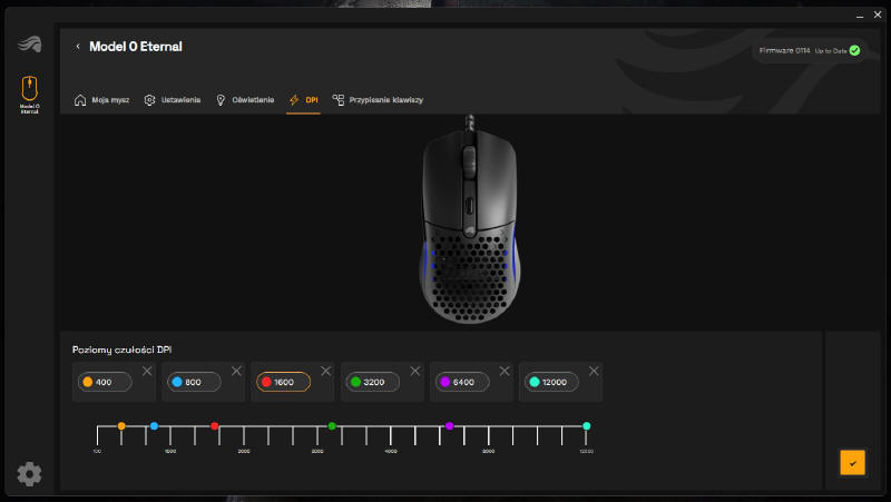 Wspominałem wcześniej, że ustawieniami DPI możemy "żonglować" w ustawieniach. Standardowo mysz odsłania się nam w ustawieniach 400/800/1600/3200 i 6400 DPI. Aby włączyć maksymalną, dostępną wartość, należy nacisnąć "plusik" i wtedy pojawi się nam wartość 12000 DPI. Równie dobrze możemy każde z ustawień dowolnie usunąć i wstawić swoją preferowaną liczbę (ustawienia co 100 DPI), a każde z nich w wybranej kolejności. O przełączeniu się na ustawienie, mysz poinformuje nas wyświetlając na bocznych projektorach RGB, stosownie przydzieloną im barwę (przez moment, później wraca do ustawionej przez nas iluminacji).