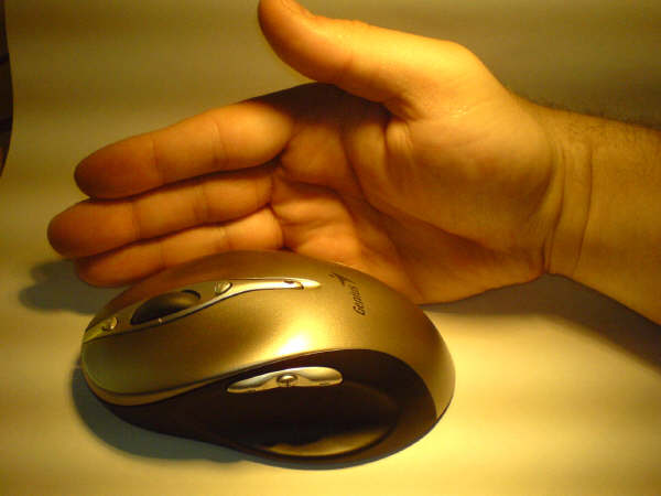 Okazałą mysz można już było podziwiać na samym początku w jej wyeksponowanym oknie ozdobnego opakowania zastawu Genius ErgoMedia R800. Przy bliższym kontakcie faktycznie przekonamy się, że mamy do czynienia z ładnym kawałkiem mychy. Nie da się ukryć powiązań rodzinnych z klawiaturą ErgoMedia, a jej kształt zdradza przeznaczenie dla osób praworęcznych mimo, że w panelu sterowania funkcjami znajdziemy możliwość przełączenia kierunku klawiszy dla osób leworęcznych. Trzymanie jej lewą ręką nie należy do najprzyjemniejszych zajęć.
