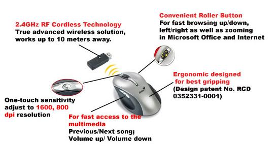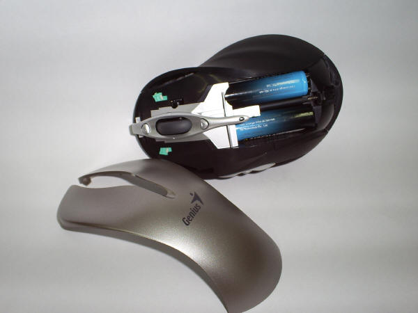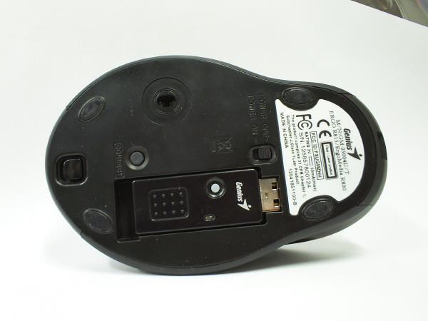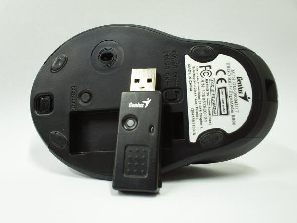 W spodniej części podstawy myszki Geniusa umieszczono schowek na klucz-odbiornik radiowy USB. Jego wsunięcie w mysz automatycznie wyłącza urządzenie, zapobiegając przypadkowemu włączeniu przy np. przenoszeniu.