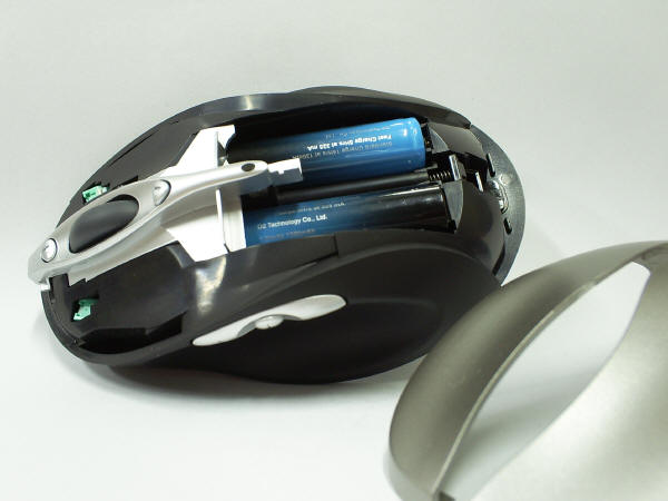 Górna, srebrna pokrywa zintegrowana w jedną część z przyciskiem lewym i prawymi, stanowi element maskujący schowek baterii typu AA (w zestawie dwa akumulatorki).