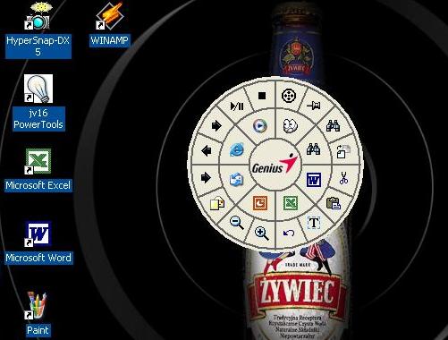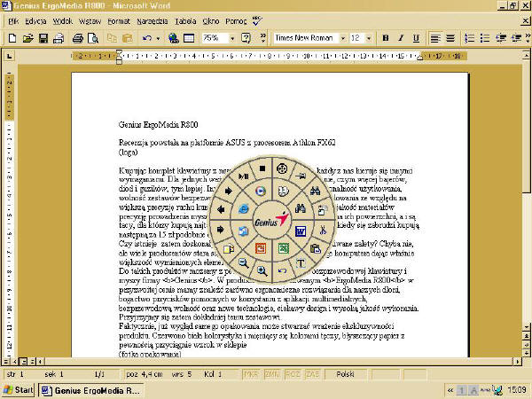 Naciśnięcie kółka Scroll uruchamiało automatycznie ikonę okrągłego zbioru narzędzi, z którego możemy wybrać dowolne funkcje przydatne przy pracy z aplikacjami bądź w Internecie. Działa to zarówno na pulpicie, jak i np. w Wordzie i naprawdę bywa pomocne.