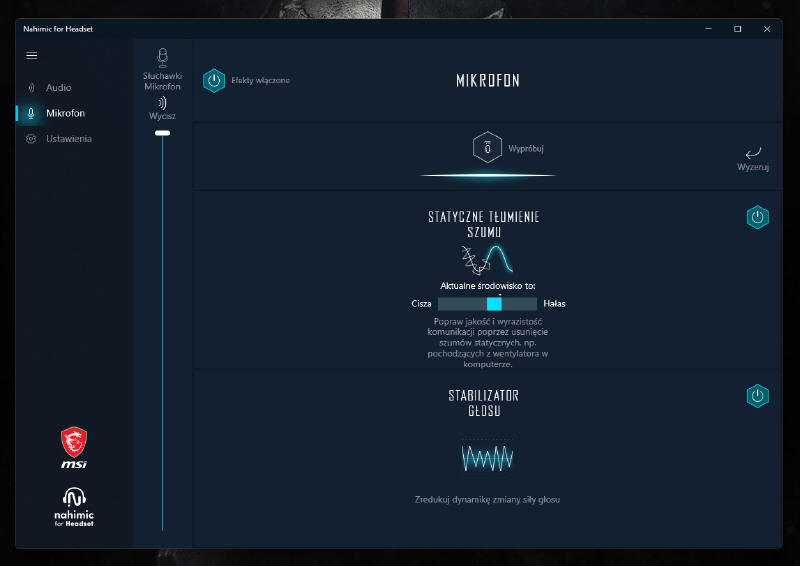 Mikrofon posiada swoją zakładkę, która pozwoli nam na ustawienie czułości systemu tłumienia dźwięków z otoczenia. Może to być przydatna funkcja przy rozgrywkach w publicznych miejscach (jak np. zawody LANParty), a o stabilizację generowanego przez nas głosu, zadba automatyka (jeśli ją włączymy).