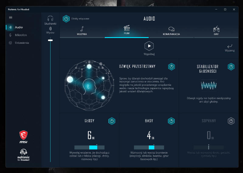 Program Nahimic for Headset daje nam już takie narzędzia, jak sterowanie zakresami basów, sopranu czy podbicia zakresu dla dialogów, a wszystko to dla osobnych, predefiniowanych działów, jak Muzyka, Film, Komunikacja i wreszcie Gier. Dodatkowo możemy sobie włączać generowanie dźwięku przestrzennego, z czego w dziale Muzyka jest on domyślnie wyłączony i lepiej z niego nie korzystać, bo wtedy przy wejściowym sygnale stereo, potrafią się pojawiać jakieś dziwnie pływające (falujące), zniekształcenia.