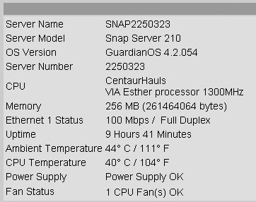 W tym miejscu należy wspomnieć nieco o chłodzeniu sprzętu. Jak widzicie w środku obudowy, nad wszystkimi komponentami i pod HDD jest dosyć sporo wolnego miejsca. Tak zaprojektowana konstrukcja pozwoliła na zastosowanie tylko jednego wiatraka, który bez problemu daje radę z utrzymaniem odpowiedniej temperatury (około 40 stopni na procesorze). Jest on zamontowany na tylnym panelu i ustawiony w taki sposób, aby wydmuchiwał powietrze z obudowy. Ponieważ jest ona szczelnie zamknięta, powietrze zostaje jednocześnie zasysane do środka przez „kratkowany” przód. Dzięki takiemu rozwiązaniu wszystkie komponenty i radiatory wewnątrz owiewane są zimnym powietrzem. Należy także zaznaczyć, że obroty wiatraka są uzależnione od temperatury. Podczas startu Snap Server zostaje „przedmuchany” zimnym powietrzem, następnie „śmigło” znacznie zwalnia (i przy okazji hałas znika). Podczas normalnej pracy z NAS’a dobiega niezbyt głośny szum. Trzeba przyznać, że chłodzenie działa bardzo sprawnie. Po prawie dziesięciu godzinach pracy, sytuacja prezentowała się następująco: