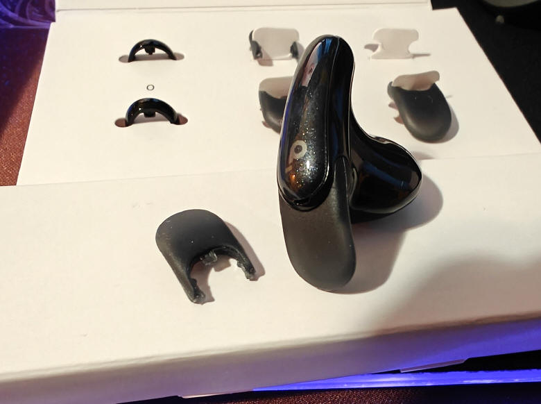 W środku przywita nas samouczek pokazujący, jak wydobyć słuchawki z etui, a pod nim znajdziemy elegancko zapakowane opakowanie stanowiące jednocześnie powerbank, kabelek USB pomocny przy podłączeniu do źródła zasilania oraz kartonik z "uszkami" o różnych rozmiarach, które możemy wymieniać w kadłubku lewej i prawej słuchawki, dostosowując jej długość do wymiaru wewnętrznej części małżowiny naszego ucha. Gdybyśmy nie chcieli z nich korzystać, możemy szparkę przeznaczoną do ich montażu zamknąć dedykowanymi półpierścieniami, co pozwoli uzyskać jednolitą powierzchnię kadłubków.