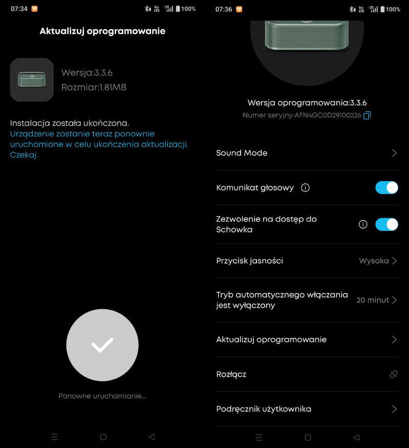 Warto ściągnąć na telefon dedykowaną Appkę od marki SOUNDCORE, bo dzięki niej zyskamy sporo dodatkowych możliwości ustawień audio i szybkiego sprawdzenia stanu naładowania baterii. Co ważne przy pierwszym jej uruchomieniu, aplikacja natychmiast wykryła nową wersję oprogramowania systemowego Firmware i zaproponowała aktualizację.
