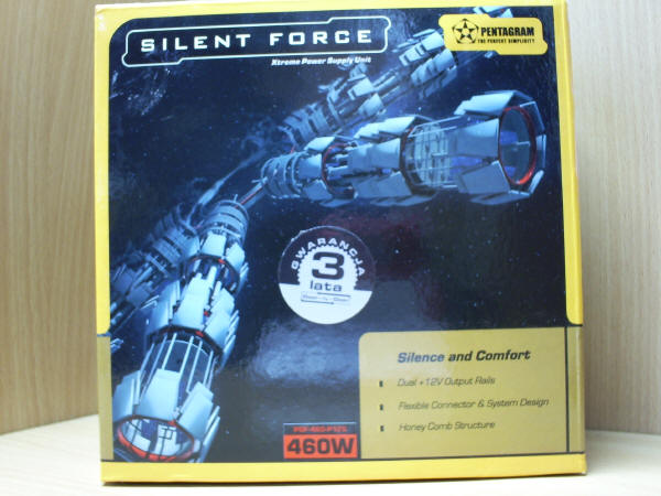 Co trzeba przyznać firmie Pentagram, to potrafią przyciągnąć uwagę potencjalnego klienta oglądającego sklepowe półki. Kartoniki sugerują kosmiczne technologie ... przynajmniej na poziomie stacji kosmicznej. Opakowanie 460-tki jest troszkę mniejsze. Znajdziemy na nim informacje o podwójnej linii +12V.