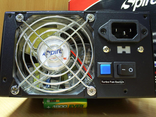 Z frontowej strony Spire SP-ATX-Z500W-EU panuje wentylator wykonany z przezroczystej masy pleksiglasowej, podświetlanej diodami LED na kolor niebieski. Obok gniada zasilania i włącznika I/0 znajdziemy też tajemniczy, niebieski przycisk opisany jako : Turbo Fan Switch. Jak łatwo się domyślić, jest to ręczny włącznik trybu przyśpieszającego obroty wentylatora do poziomu maksymalnych obrotów. Ciekawe rozwiązanie, ale nieco więcej napiszę o nim podczas samych testów.
