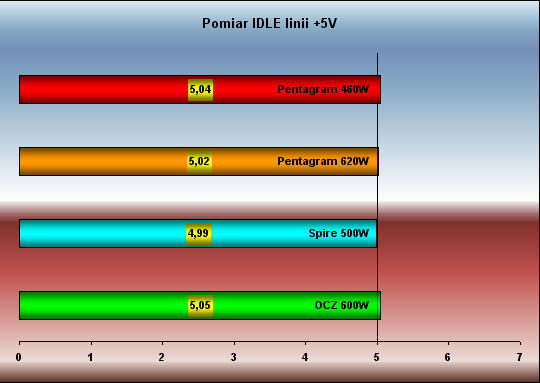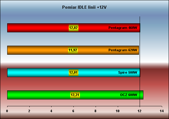 Pierwszy pomiar IDLE był wzorowy dla wszystkich linii. OCZ ma tendencje do zawyżania napięcia 12V (podobnie jak produkty Tagana i SilverStone), i tak odnotowałem 3.33V, 5.05V i 12.31V.