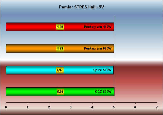 Jednak obciążenie komputera aplikacjami testowymi powoduje u Spire największy spadek napięcia linii +12V. Najniższe wskazanie wynosiło 11.86V co daje różnicę wynoszącą 0.25V. Pozostałe linie nie odczuły już tak mocno wytężonej pracy jednostki (3.28V / 4.97V)