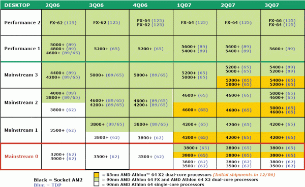 DailyTech uzyskał roadmap dla procesorów Athlon i Sempron, który sięga tylko do trzeciego kwartału 2007 roku ale i tak odkrywa kilka nadchodzących produktów. Pierwszy z nich to Athlon FX-64 którego zobaczymy już w kolejnym kwartale, oczywiście na podstawce AM2. AMD ma w zwyczaju podnosić prędkość o 200 MHz więc prawdopodobnie FX-64 otrzyma zegar 3 GHz, przy współczynniku TDP na poziomie 125 watt. Jednostka ta będzie flagowym produktem AMD do 3 kwartału 2007 kiedy to nadejdzie FX-66 wykonany jeszcze w 90nm. Szczegółowe tabele w dalszej części newsa.