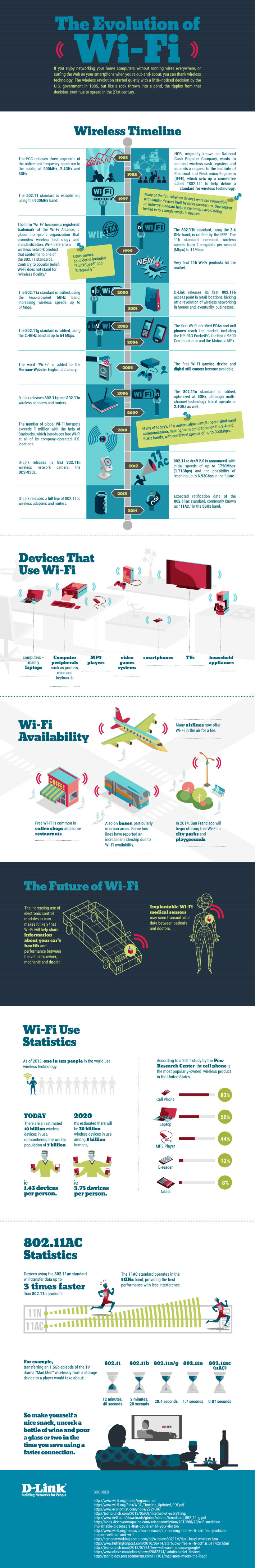 Czy zastanawialiście się w jaki sposób ewoluował bezprzewodowy internet? Jeżeli odpowiedz brzmi „tak” to zapraszamy na podróż w czasie razem z D-Linkiem. Producent ten przygotował ciekawą infografikę prezentującą od samego początku po czasy obecne rozwój WiFi. Czy wiedzieliście, że na świecie istnieje 10 miliardów urządzeń wyposażonych w moduł Wifi? Dla porównania światowa ludzka populacja oscyluje w granicach 7 miliardów osób. Innym określeniem na Wi-Fi jest także FlankSpeed oraz DragonFly.