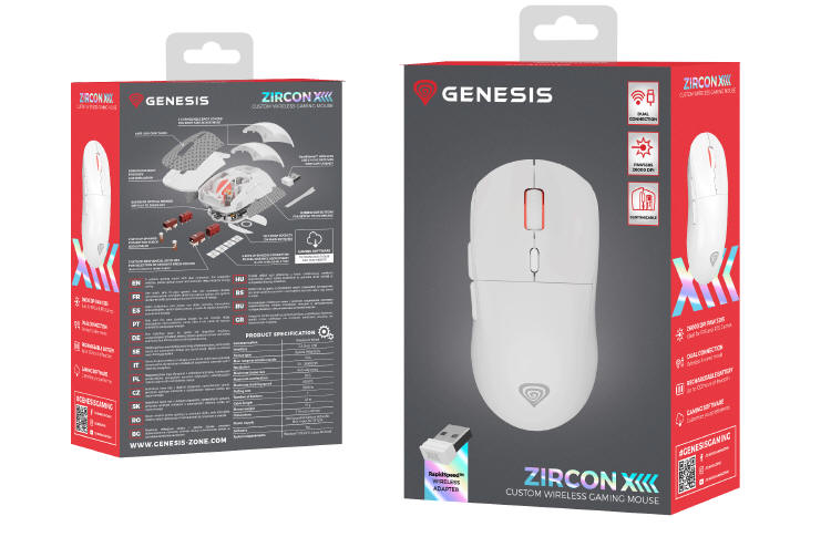 GENESIS Zircon XIII to najbardziej zaawansowana mysz w portfolio GENESIS, przygotowana z okazji 13-lecia marki. Dzięki wymiennym elementom model ten można dopasować do własnego stylu gry, co w połączeniu z bezprzewodową komunikacją RapidSpeed Wireless, możliwością pracy nawet do 100 godzin oraz jednym z najlepszych sensorów na świecie (Pixart PAW3395) sprawia, że trudno o bardziej kompletną i niezawodną myszkę na rynku. GENESIS Zircon XIII oferuje możliwość wymiany przełączników przycisków głównych bez lutowania (gniazda hot – swap), montażu sprężyn do zmiany ich siły nacisku (15g/25g), a nawet regulacji skoku (0.4/0.5/0.6/0.7 mm) dzięki dołączonym dystansom.
