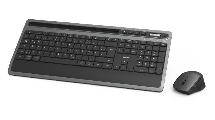 Bezprzewodowa klawiatura została zaprojektowana z myślą o szybkim i łatwym czyszczeniu, dzięki płaskim i pojedynczo rozmieszczonym klawiszom. Ergonomiczny kształt doskonale pasuje do dłoni osób praworęcznych i pozwala na komfortowe pisanie oraz pracę. Uwagę zwraca specjalna wydrążona szczelina na położenia tableta lub smartfona, co wyraźnie ułatwia korzystanie z całego zestawu. Klawiatura może się pochwalić siedmioma przyciskami multimedialnymi. Laserowy nadruk na łącznie 105 przyciskach zapobiega łatwemu ich starciu. Co więcej, funkcja FN-Lock pozwala szybko zmieniać między pierwszym a drugim przypisaniem klawiszy funkcyjnych. Jest to szczególnie praktycznym rozwiązaniem, gdy częściej używa się funkcji multimedialnych niż funkcji klawiszy F. Klawiatura od marki Hama zasilana jest przez baterię AA.