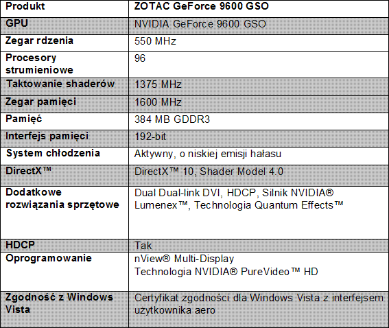 ZOTAC International w dniu dzisiejszym zaprezentował swoją najnowszą kartę graficzną ZOTAC GeForce 9600 GSO, która udostępni szerokim rzeszom graczy i entuzjastów komputerowej rozrywki wysoką wydajność w segmencie rozwiązań budżetowych. ZOTAC GeForce 9600 GSO wykorzystuje zunifikowaną architekturę NVIDIA bazującą na ultra wydajnych procesorach strumieniowych taktowanych zegarem 1375 MHz. Ponadto karta została wyposażona w 384 MB szybkiej pamięci GDDR3, pracującej z częstotliwością efektywną 1600 MHz, która do komunikacji z GPU używa 192-bitowej magistrali. Ponadto najnowszy produkty ZOTAC, to również wsparcie dla technologii NVIDIA PureVideo HD, która pozwala na sprzętowe dekodowanie filmów HD zapisanych na nośnikach Blu-ray i HD DVD. Dodatkowo, dzięki PureVideo HD, możemy liczyć na znaczna poprawę obrazu. (Dalej) ...