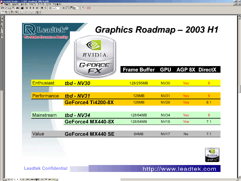 Oto kilka poufnych danych o Leadtek-u na temat planów dotyczących pierwszej połowy 2003 roku, oraz drugi obrazek z rodziną GeForce4 MX440-8X.