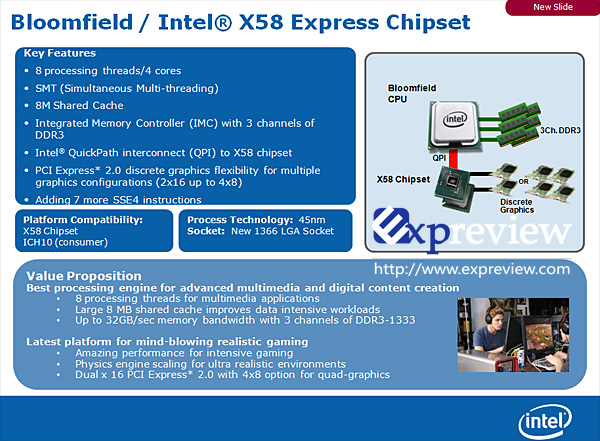 Płyty główne dla Nehalemów zbudowane będą na chipsecie X58. Zapowiada się, że mogą być jeszcze droższe niż obecne topowe X48, a wszystko przez trójkanałowy kontroler pamięci znajdujący się w procesorze. Wymaga on odpowiednich połączeń i na razie zapewniają to tylko 8-mio warstwowe płyty główne, a te do tanich nie należą. Intel poprosił nawet o pomoc producentów płyt głównych w rozwiązaniu tego problemu tak aby dało się stworzyć wersje 6-cio warstwowe lecz może to potrwać nawet pół roku więc na premierę dostaniemy raczej tylko 8-mio warstwowe laminaty.