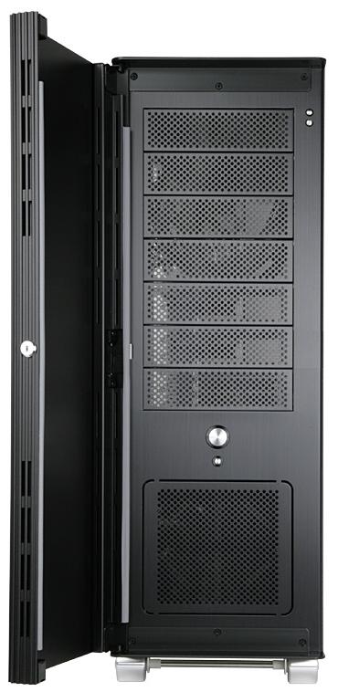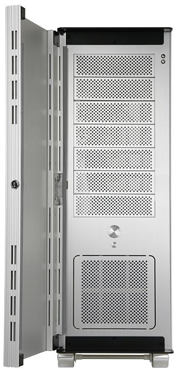 Firma Lian Li od wielu lat dostarcza na rynek produkty najwyższej klasy. Obudowy wykonane ze szlachetnego aluminium, są technicznym i stylistycznym majstersztykiem. Przedni, niesamowicie wyprofilowany równoległymi frezowaniami panel modelu PC-V2110A/B (A- srebrna / B- czarna)to pancerna obudowa, stonowana kolorystyka, elementy z litego szczotkowanego aluminium. We wnętrzu mamy możliwość zainstalowania siedmiu zewnętrznych napędów 5.25" oraz ośmiu wewnętrznych 3.5" umieszczonych w specjalnej klatce. Montaż przebiega szybko i sprawnie, nie trzeba używać narzędzi, w zestawie znajduje się komplet specjalnych zacisków. Na górnym panelu znajdziemy też szereg podręcznych gniazd - cztery USB, Firewire, eSATA, słuchawkowe (HD Audio) oraz mikrofonowe. (Dalej) ...