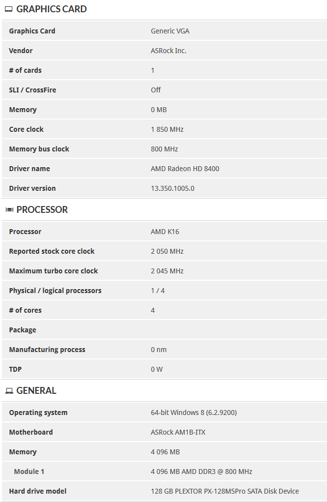 Abyście mogli osobiście porównać możliwości zestawu komputerowego z Athlonem 5350 na pokładzie ze swoją "tradycyjną" maszyną lub laptopem, zamieszczam wyniki kilkunastu popularnych benchmarków. Na początek wymagający, najnowszy 3DMark. Pierwsze testy w niższych rozdzielczościach Radeon HD 8400 pokonuje bez zająknięcia, dopiero Demo zabija jego możliwości, ale na tym teście potrafi wymięknąć niejedna dedykowana karta graficzna...