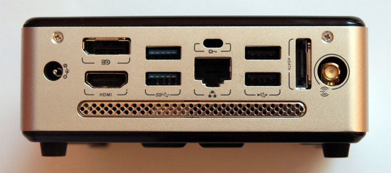 Z tyłu bogato – od lewej: wejście zasilacza, wyjścia HDMI i DisplayPort, dwa porty USB 3.0, port LAN oraz blokada Kensington, kolejne dwa USB, tym razem 2.0, port eSATA oraz złącze anteny WiFi.