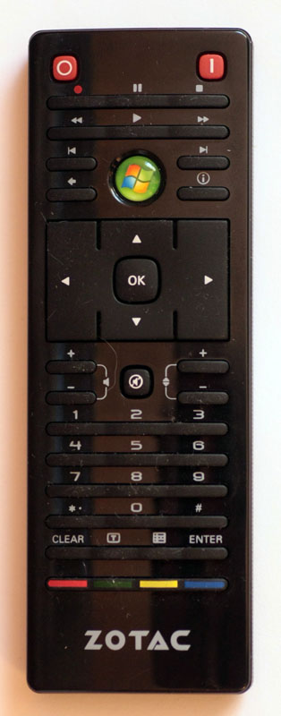 Jak zapewne zauważyliście na jednym z boków opakowania do zestawu dołączony został pilot zdalnego sterowania. Rozmiarami nawiązuje on do samego komputerka, a działaniem odpowiada standardowi Windows Media Center.