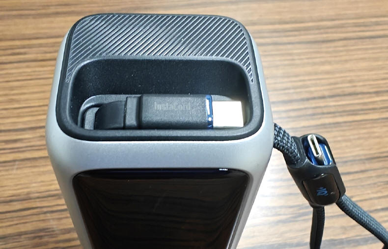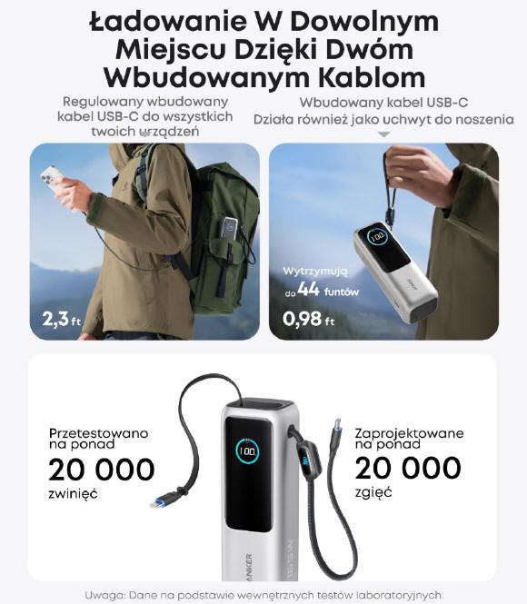 Spytacie, że co, tylko dwa gniazda? Otóż ANKER daje nam możliwość nie noszenia z sobą okablowania, bo w standardzie dostajemy dwa przewody USB-c, ale dość sprytnie ukryte, bo jeden na górze kadłubka jest automatycznie zwijany, jak kabel odkurzacza (całkowita długość, to 65 centymetrów) i co ważne możemy go wysunąć tyle, ile aktualnie będziemy potrzebować, bo posiada mechanizm samohamujący. Kolejne pociągnięcie go powoduje przejście w stan zwijania. Jego wtyczka jest unieruchomiona mocnym magnesem, co zapobiega jej odstawaniu od obudowy. Według producenta mechanizm zwijania jest bardzo trwały i może przetrwać około 20 tysięcy cykli pracy.