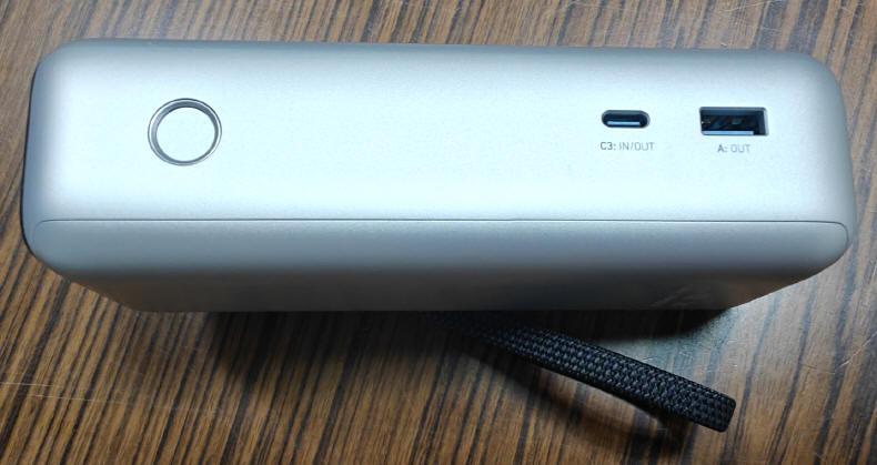 Do tej pory większość powerbanków w moich rękach, miało spłaszczony kształt, tymczasem ANKER Laptop w swoim przekroju jest zbliżony bardziej do (niemal) kwadratu, co nadaje mu eleganckiej smukłości. Na froncie prócz logo producenta, jest wspomniana, ciemna osłona ekranu wyświetlacza, natomiast na lewo od niego umieszczono przycisk kontroli stanu naładowania i parametrów pracy banku. Poniżej zaprojektowano dwa gniazda - USB-c (wejście - wyjście) i USB-A (wyjście).
