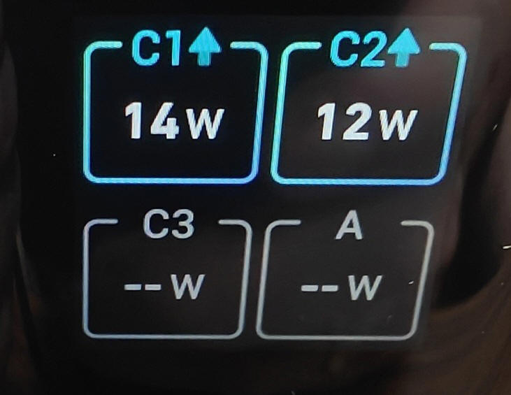 Jeśli jednak chcemy się dowiedzieć, ile mocy oddają poszczególne "gniazda", wciskamy ponownie boczny przycisk i otrzymujemy pełne dane. C1 - oznaczony jest wysuwany przewód, C2 - boczna "pętelka", C3 - to gniazdo na bocznym panelu, natomiast C4 - przydzielono dla portu USB-A.