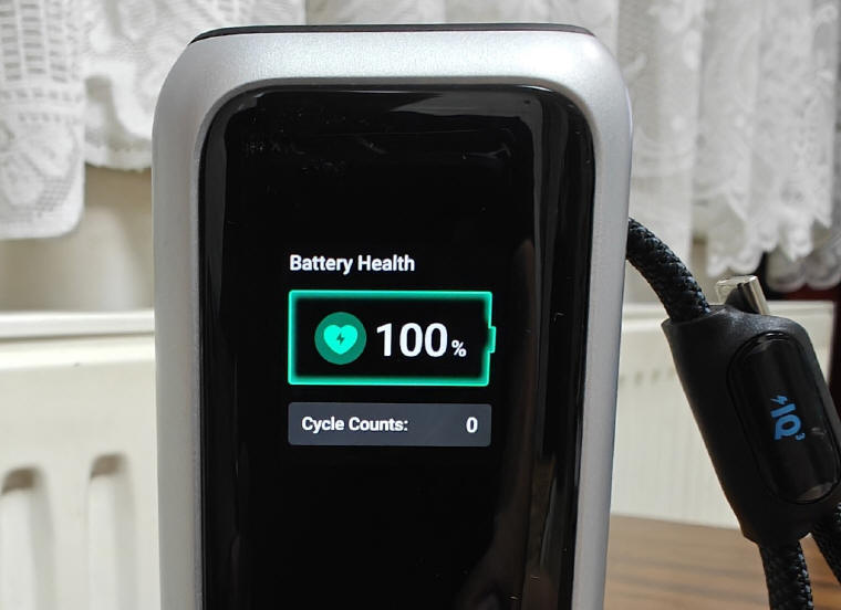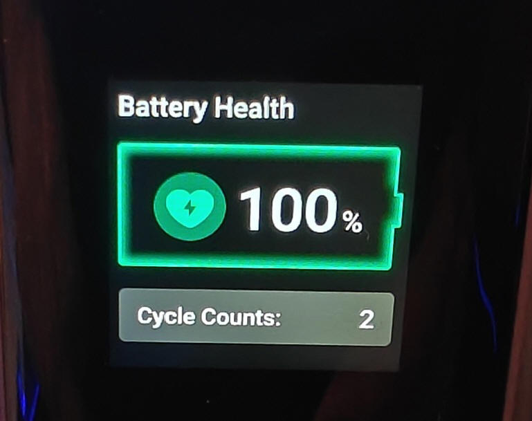 Kolejne przyciśnięcie bocznego kontrolera przełączy nas na okno kontroli temperatur pracy ogniw, a jeszcze następne wejdzie w tryb testu ich stanu kondycyjnego oraz ilości wykonanych cykli ładowania.
