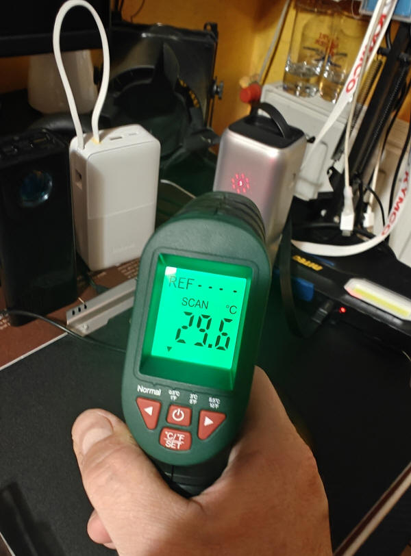 Wskazania temperatury powerbanku ANKER Laptop A1695H11 25000mAh 165W można uznać za wiarygodne, bo podawana temperatura ogniw podczas pracy oddawania energii, była niemal identyczna z pomiarem termo miernika (sensor podczerwieni). I faktycznie przy dotyku obudowa była lekko, ale wyczuwalnie ciepła.