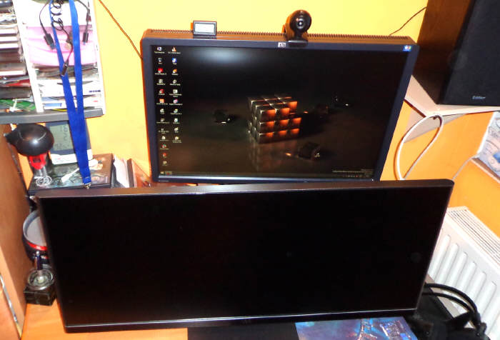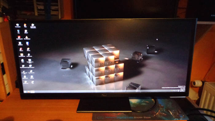 Czas podłączyć Monitor do prądu i komputera. Mam za małe biurko, by pomieścić dla porównania model AOC i mojego 24-calowego HP, więc ustawiłem jeden za drugim. Co prawda perspektywa widziana "okiem" aparatu fotograficznego troszeczkę wypacza rzeczywistość, to mniej więcej tak właśnie wygląda różnica miedzy standardami 21:9 SuperWide i 16:9.